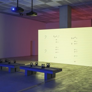 An ecology of sound scenes shapes the experience of both Tripartite Confrontation and Bespoke Wallpaper Music. It is this ecological sensemaking that extends Kim’s sonic interventions into realms of material, psychic, and affective implications. Sound is emplaced in the thriving vitality of ecology—not just spoken of in relation to its technology or style or aesthetic or even art history, but through the ever-evolving history of sense and the sensible. This ecology is also structured by what French film theorist Michel Chion discusses as the “acousmatic,”6 or the experience of sound without knowing its sources. A vaster relational world is implied though this acousmatic intuition, precisely, an ecology that exists beyond the immediacy of the exhibition space.