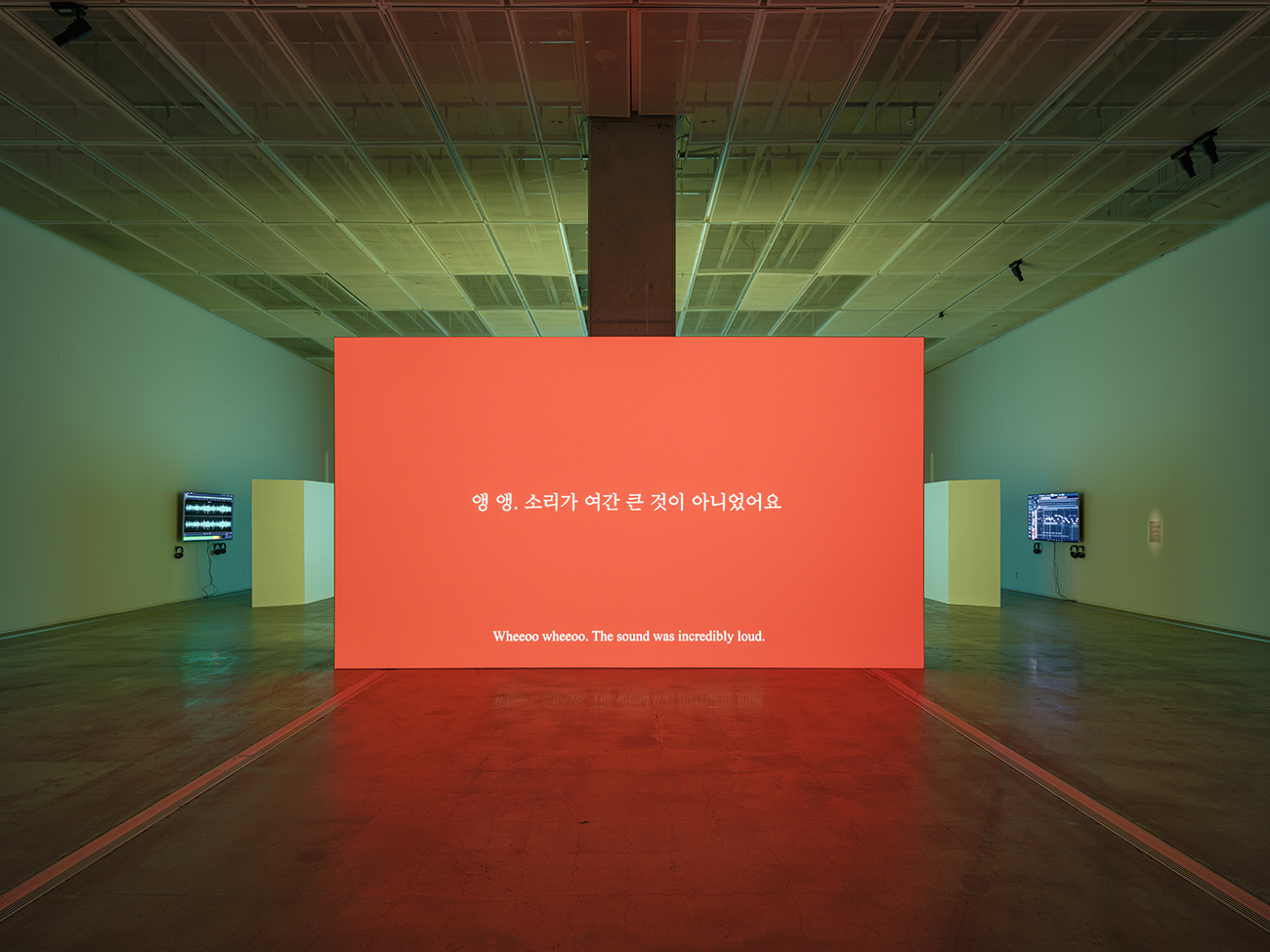 Scholars and artists alike have argued that listening is more than focused attention; it is also a process of becoming aware of how ideology may creep into the act of listening itself.3 Xochitl Marsili-Vargas suggests that “while listening is an act of interpretation, it also entails occupying a particular social space, a way of being in the world.”4 The listener’s context is distinct and thus institutes agency over how a given sound is codified and represented. But listening to sound is not without ethics or responsibility. According to Kim, a question that guides her practice remains: “What possibilities can listening offer in knowledge production and decolonization processes?”5 In many of her works, Kim’s “sonic ethnographies” seek to represent, with care and fidelity, the overlaps of history and acts of political dissent that resonate beyond official state narratives. Notably, this methodology observes sounds in all modalities, from text to music to environmental and paralinguistic. Throughout her practice, Kim assigns unique significance and transformative potential to sounds thought to have none or that evade the immediacies of legibility.