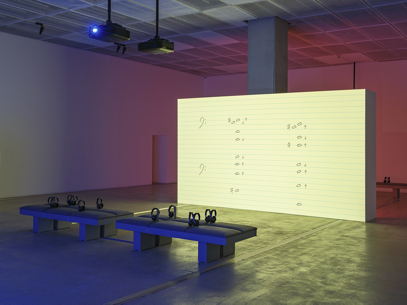 The seventeen-minute video Brilliant A (2022) offers an account of the arrival of the first piano in Daegu, South Korea, which was brought by an American missionary. The piano was used to introduce the Pitch A, the standard by which instruments are conventionally tuned. In Ear Training (2022), a fifteen-minute video, Kim considers the collision of aesthetic education with Japan’s colonial and military history in Korea. The work simulates pitch-perception exercises that were designed in Japan during the country’s occupation of South Korea: students and army officers were made to listen to the drone of army planes and asked to notate what sounds they heard. Both works denaturalize sensemaking by mapping its learning and adaptation within frameworks of coloniality and warfare, interrogating relational agencies around sound—sensing it, learning it, discoursing about it—politically, ethically, and pragmatically charged. The history of the sensible is also the politics of it.