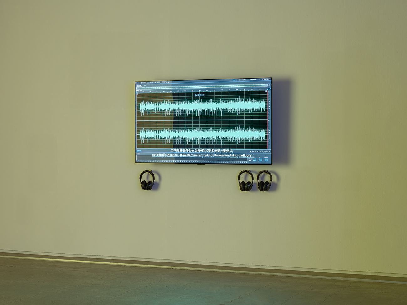 This question of ecological sensemaking offers us a glimpse of the history of the sensible in the contexts that the artist works within: music (traditional music knowledge systems and instruments; the production and reception of pop music in Korea and their use in ideological contestations across the DMZ border); urban environments (various contexts of audition in urban spaces, such as announcements used in public infrastructures [transportation, telecommunications, mass media]); protests; memory work. Throughout the practice of the artist, sound is emplaced in wider ecologies and cultures. In the context of both works discussed above, sound is not just a mode of textuality meant to be read, listened to, and deciphered; it also embodies infrastructures of sensing, recognition, translation to value, and the concomitant questions of assemblies and circulations. These elements are addressed and sound as culture is mapped out and fleshed out as an ecology.