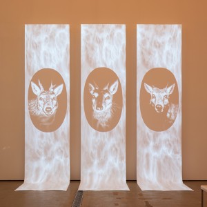 Non-futuristic images both invite and reject futurity, and sometimes by their absence they testify to its impossibility. The trail cameras placed by environmental activists to monitor nocturnal animals’ habitats often capture no images. If a few animals are seen, they prove the animals are there, leading to optimism, but also to pessimism because this process is recording their disappearance. However, it is also a futuristic process because these images will be used as source materials to designate the protected area. Nonetheless, when these trail camera images are decontextualized and uploaded as the wildlife version of funny home videos on the internet, those animals, incarcerated in the frames, look immortal, nondecaying, and irretrievably absent at the same time. Unmake Lab sees no future in human-crafted nature images and “generic nature,” which is a material simulation of nature that once demolished and recomposed according to human desires.4 However, the artists still wonder what kind of future awaits us. They visit the natural history museums that exhibit the taxonomy of extinct animals and train generative artificial intelligence systems by feeding them information about disappearing species. In their practices, there is a haze of expectation that non-human beings might communicate with each other to make up unexpected stories even as humans create, select, and interpret the images as they wish. However, the laboriously gathered images of animals have been blurred like ghosts or algorithmically synthesized to form a pet-like facial expression that panders to our emotional expectation.